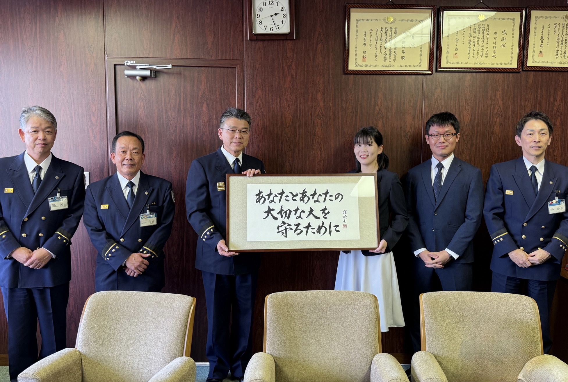 また、堺市消防局長の新子様、消防局次長の山﨑様、総務部長の古川様、予防部長の妙中様ともお話しさせていただき、書道の魅力や今回の取り組みに込めた思いをお伝えする機会をいただきました。