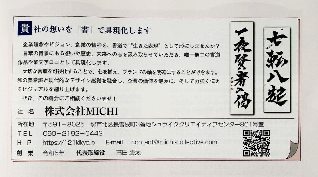 この度、大阪府堺市を拠点に筆文字ロゴ制作や書道作品の提供を行う株式会社MICHIの取り組みが、堺商工会議所の広報誌「compass sakai」2026年度4月号にて紹介されました。