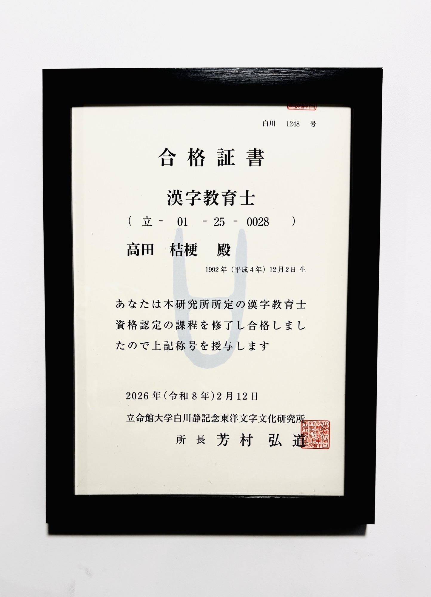 この度、立命館大学白川静記念東洋文字文化研究所のカリキュラムを受講し、無事に試験に合格。立命館大学認定「漢字教育士」の称号をいただくことができました!