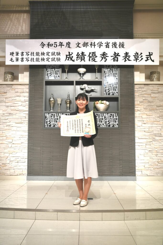 また、毛筆書写技能検定においては、一級主席合格ということで、文部科学大臣賞を受賞いたしました。これらを取得したことによって、幅広い知識を得ることができ、多くの出会いにもつながりました。